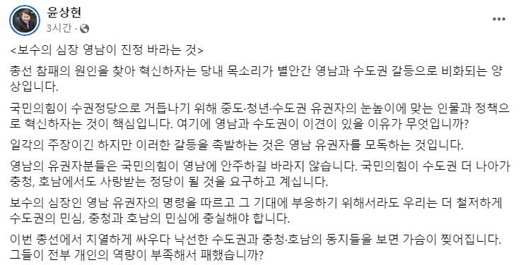 이러한 상황에서 윤상현 의원은 자신의 페이스북을 통해 영남과 수도권 간의 갈등을 부추기는 것은 영남 유권자를 모독하는 행위라고 반박했습니다.