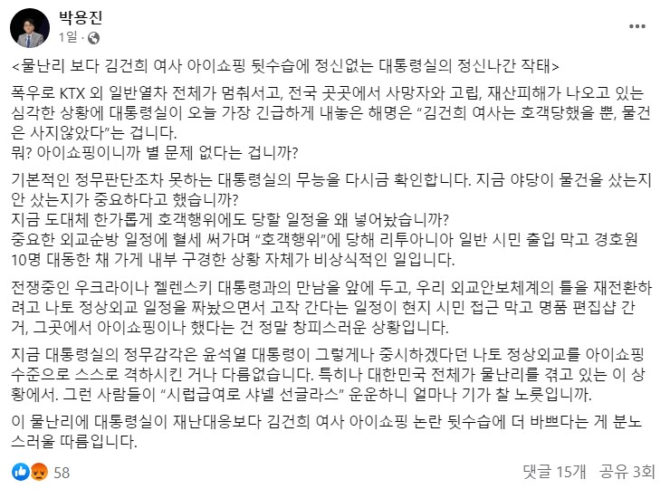 박 의원은 "폭우로 인한 심각한 상황에서 대통령실이 제일 긴급하게 내놓은 해명이 '김건희 여사는 호객당했을 뿐, 물건은 사지 않았다'는 것"이라며, 대통령실의 무능을 비판하였습니다. 또한, "물난리에 대한 대통령실의 대응보다 김건희 여사의 쇼핑 논란 뒷수습에 더 바빴다"고 강하게 지적하였습니다.