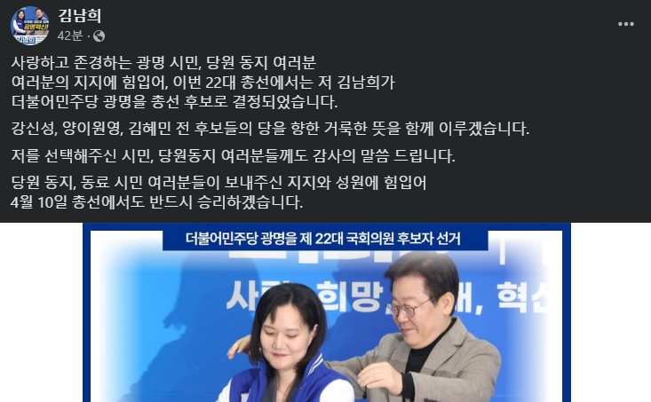 이변은 없었습니다. 더불어민주당 경기 광명을 공천 경선에서 친명 영입인사 김남희 변호사가 비명계 현역 양기대 의원을 꺾고 공천을 따내 화제가 되고 있습니다.