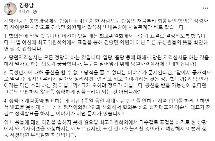 이에 개혁신당 김용남 정책위의장은 즉각 페이스북을 통해 김종민 최고위원의 주장에 대해 반박하며, 당원 자격 심사와 특정 인물에 대한 공천 문제에 대한 입장을 밝혔습니다.
