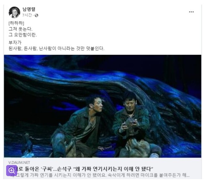 이에 남명렬 배우는 본인의 페이스북을 게시물을 통해 손석구의 이러한 발언이 오만하다고 비판하였습니다. 그는 실제로 속삭임에도 불구하고 350명의 관객에게 들리게 하는 연기를 해결하는 것이 중요하다고 주장하였습니다.