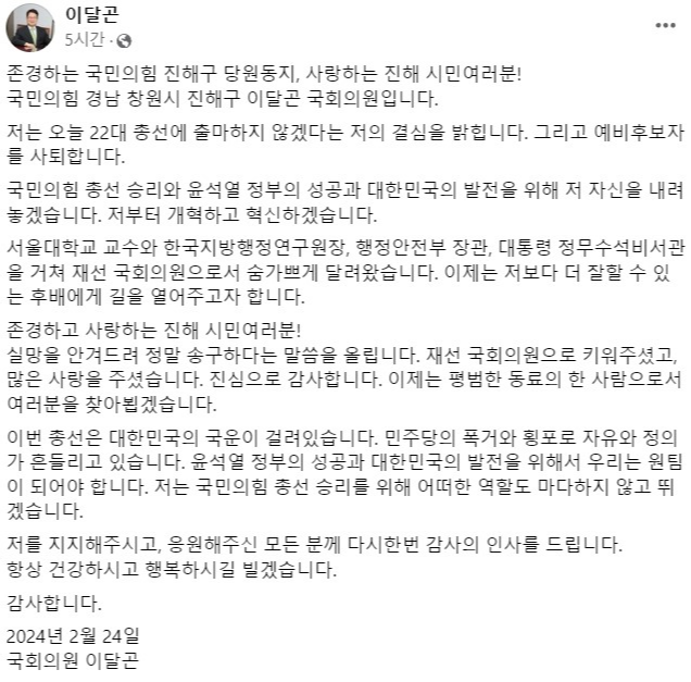 국민의힘 소속 이달곤 의원(재선, 경남 창원 진해)이 오는 4월 10일 실시되는 총선에서의 불출마를 선언하였습니다.