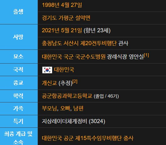 이예림 중사는 1998년 4월 27일 경기도 가평군 설악면에서 태어나 2021년 5월 21일에는 충청남도 서산시의 제20전투비행단 관사에서 극단적인 선택을 해 23세의 젊은 나이에 세상을 떠났습니다.