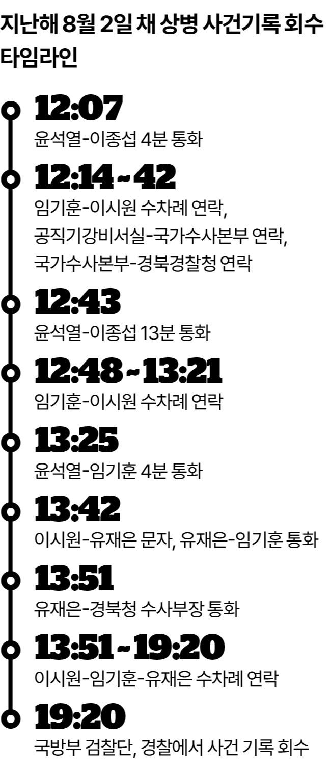 윤 대통령은 같은 날 오후 1시 25분 임 전 비서관에게 전화해 4분 51초간 통화했고, 임 전 비서관은 윤 대통령과의 통화를 마친 뒤 약 13분 만에 유 관리관에게 "경북청에서 전화가 갈 것"이라고 알려줬습니다.